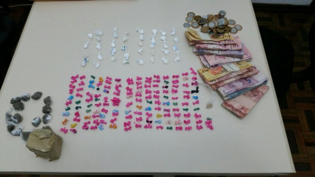Foram descobertos três locais diferentes no quintal, onde estavam enterrados os entorpecentes. Havia 144 pedras de crack embaladas para a venda, 39 petecas de cocaína, 15 buchas de maconha e R$ 1.072,00 em dinheiro.