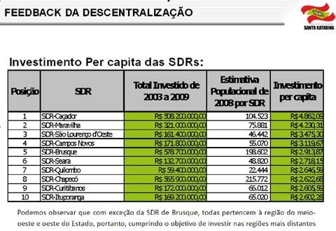 A população tem participação nas decisões, por meio dos conselhos de desenvolvimento regionais. Há mais transparência. O governo está mais perto da população. Quanto mais distante da capital, maior é o sentimento da importância das SDRs por parte da população. Outro estudo realizado pela secretaria de planejamento, só que em 2009, e que demonstrou a eficiência das SDRs, é o volume de investimento per capita entre os anos de 2003 a 2009.