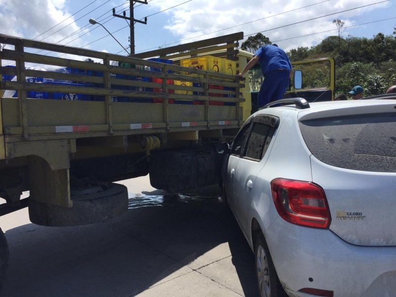Um automóvel Renault Sandero de cor branca, com placas de Imbituba, não conseguiu frear e bateu na lateral do caminhão.