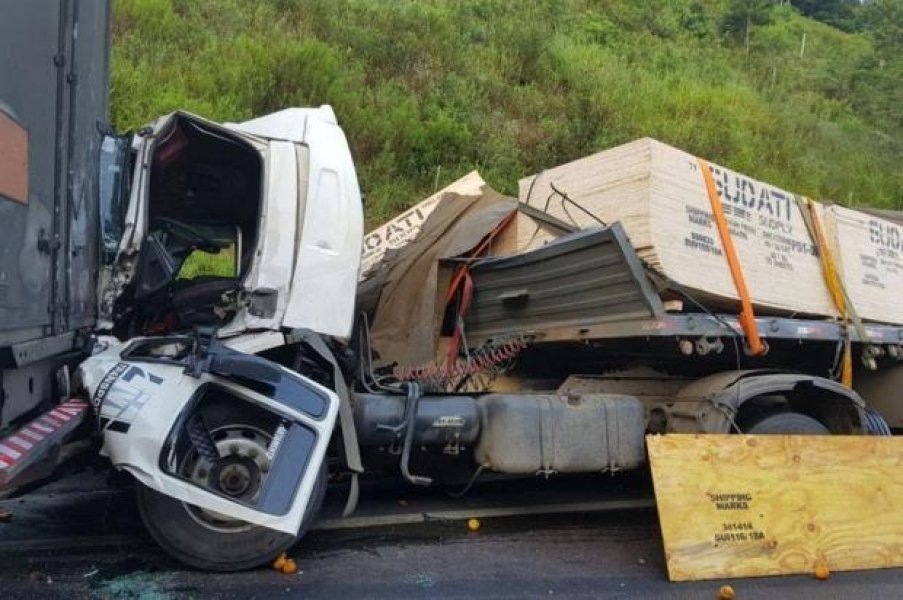 Conforme a PRF (Polícia Rodoviária Federal), um caminhão carregado com laranjas perdeu o freio na descida da rodovia e colidiu contra uma carreta, que por sua vez bateu em outro caminhão.