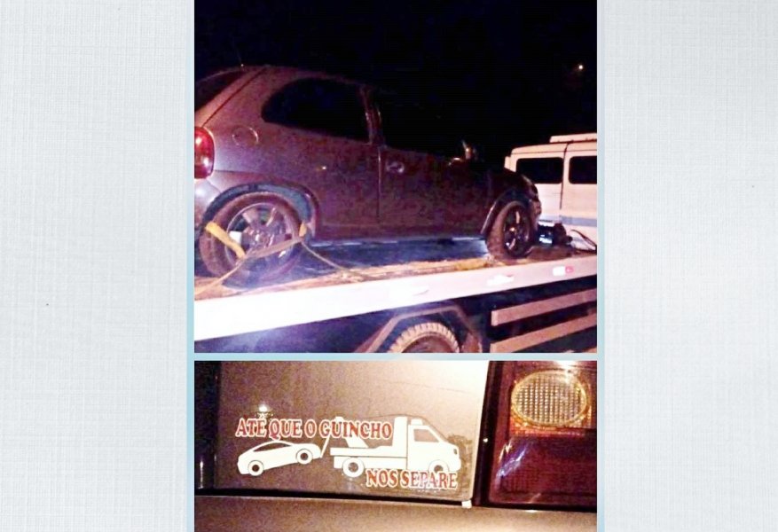 Nele, estava escrito “até que o guincho nos separe”. Com isso, realizou a abordagem e o veículo acabou sendo realmente removido, de guincho, para o pátio devido ao licenciamento atrasado.