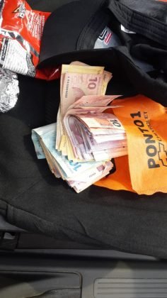 Dentro do carro, foram localizados R$ 5,4 mil em dinheiro, provavelmente provenientes do crime. No veículo também foram encontradas duas armas, um revólver calibre 38 e uma pistola calibre 22. No porta-malas, havia ainda um terno, parecido com o utilizado por um dos assaltantes, conforme imagens das câmeras de segurança da agência.