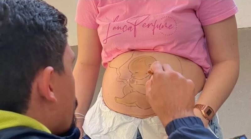As puérperas ainda puderam participar de uma atividade de pintura no abdômen, criando uma lembrança afetuosa dessa fase única, mostrando que momentos de descontração também auxiliam no bem-estar familiar e do bebê.