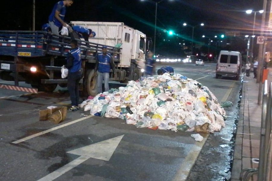 Uma imagem capturada na avenida mostra os alimentos despejados em forma de montanha sobre a pista, enquanto funcionários da PBH os recolhem e colocam em um caminhão de apoio.