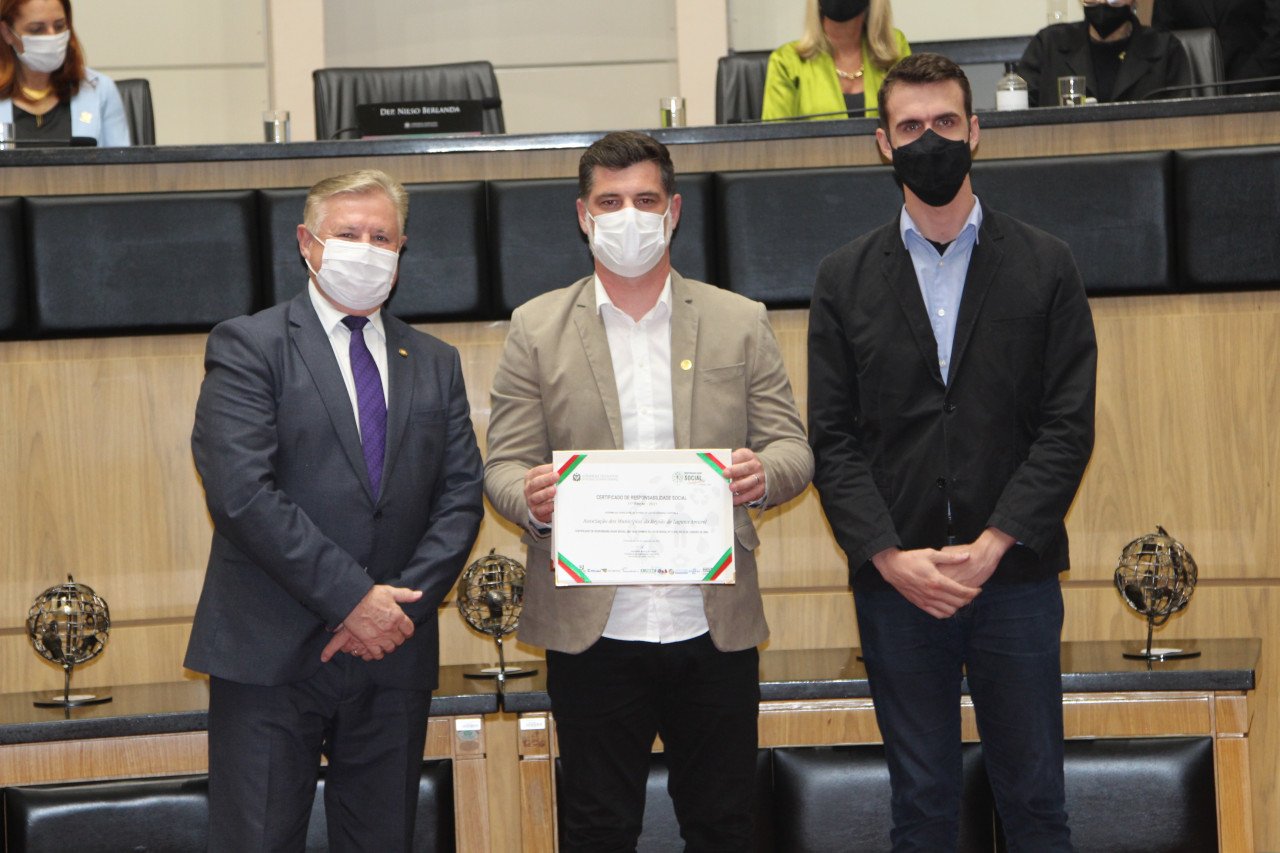 O vice-presidente da Associação de Municípios da Região de Laguna – Amurel, prefeito de Grão Pará, Hélio Alberton Júnior, recebeu nesta segunda-feira (6) à noite no auditório da Assembleia Legislativa de Santa Catarina – Alesc, o Certificado de Responsabilidade Social referente ao exercício de 2020. Hélio recebeu o certificado das mãos do presidente da sessão especial da Assembleia, deputado Nilso Berlanda. Também estavam presentes à cerimônia o diretor executivo da Amurel, Celso Heidemann, o contador da entidade, Ramon Corrêa Mendes e o jornalista Álvaro Dalmagro, da assessoria de comunicação. A premiação foi instituída em 2011 e, desde então, a Amurel já foi premiada com o Certificado, em seis ocasiões: em 2012, 2013, 2015, 2018, 2019 e 2020.