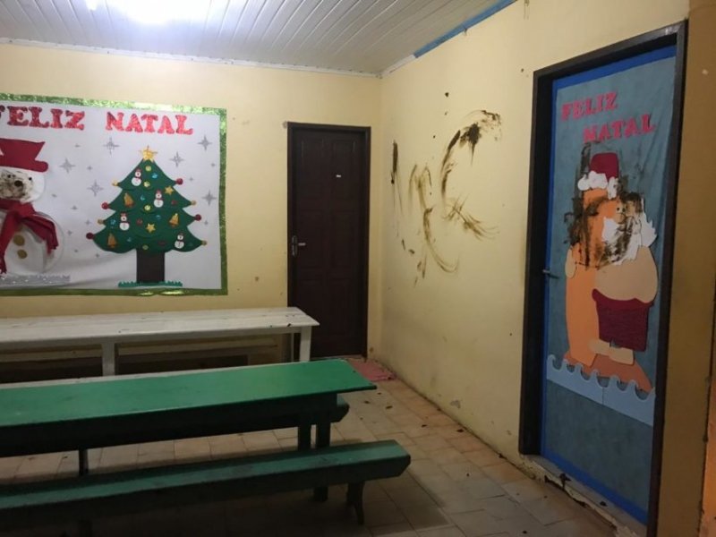 Imediatamente a PM foi ao local e a guarnição do PPT abordou o homem que estava em visível estado de embriaguez, com o corpo sujo de fezes. Desta forma, a guarnição deslocou até a Creche e constatou que três portas e três paredes estavam cobertas de fezes.