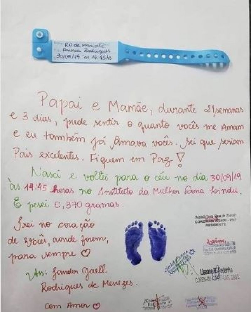 “Papai e mamãe, durante 21 semanas e 3 dias, pude sentir o quanto vocês me amam e eu também já amava vocês. Sei que seriam pais excelentes. Fiquem em paz! Nasci e voltei para o céu no dia 30/09/19 às 14:45 horas no Instituto da Mulher Dona Lindu e pesei 0,370 gramas. Irei no coração de vocês, aonde forem, para sempre. Ass: Jander Gaell Rodrigues de Menezes. Com amor”, dizia a mensagem.