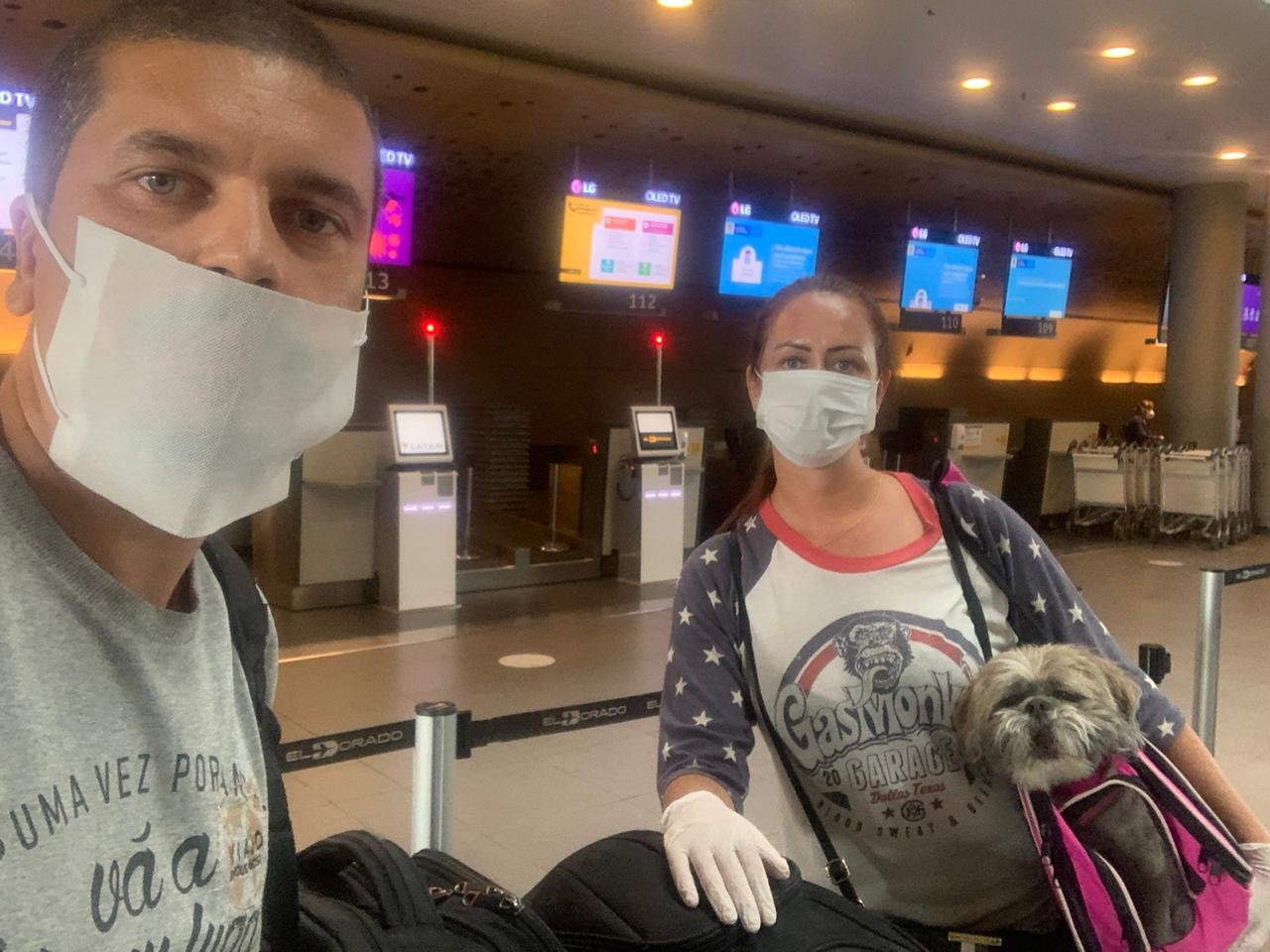 Eles estavam de carro na Colômbia e tiveram que deixar o veículo em uma base militar. Mas o maior medo era que a empresa aérea não aceitasse o embarque da Laila, cachorrinha de estimação do casal. E como sempre… no fim tudo da certo… A família só está comemorando a volta para casa.