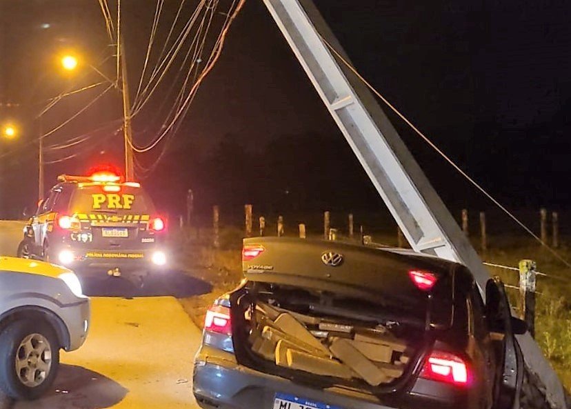 Ao tentar ultrapassar um caminhão pelo acostamento, perdeu o controle e colidiu em um poste. Os dois ocupantes do carro correram para a mata às margens da rodovia e não foram localizados.