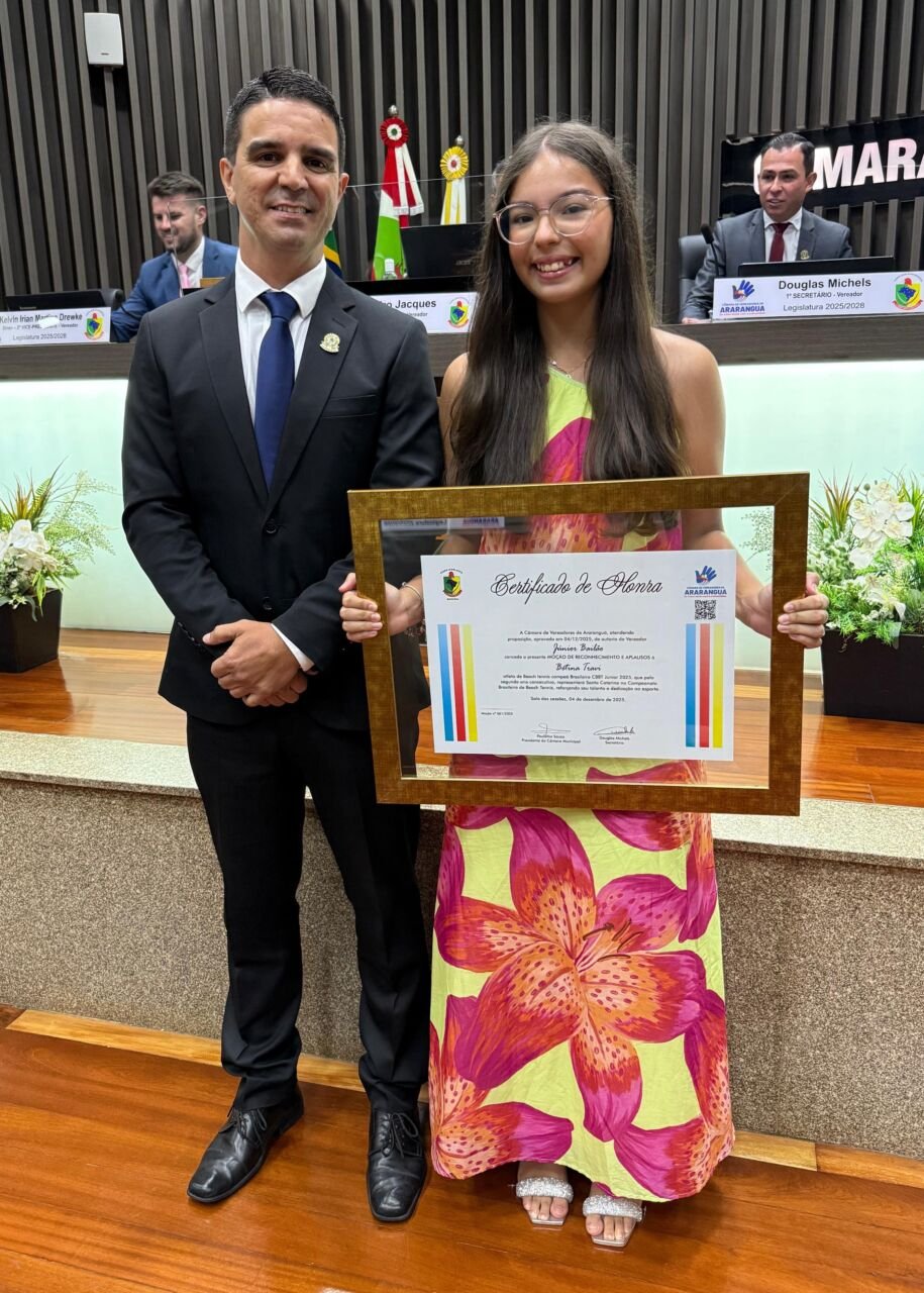 A Câmara de Vereadores de Araranguá entregou, durante a 64ª sessão ordinária, a Moção de Reconhecimento e Aplausos nº 061/2025 à jovem atleta de beach tennis Betina Travi, em razão de sua conquista como Campeã Brasileira CBBT Júnior 2025.