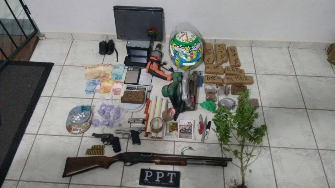 A guarnição então entrou na residência onde foram encontrados uma espingarda calibre 12, pistola 9 milímetros, um revólver calibre 38, sete munições calibre 12, oito para a 9mm, e dez munições calibre 38, dois radiocomunicadores, quatro balanças de precisão, 12 gramas de cocaína, 0,5kg de maconha, 900 comprimidos de ecstasy, um pé de maconha, vários objetos sem procedência comprovada, R$ 12.559,00 em dinheiro e sete folhas de cheque no valor de R$ 500,00 cada.
