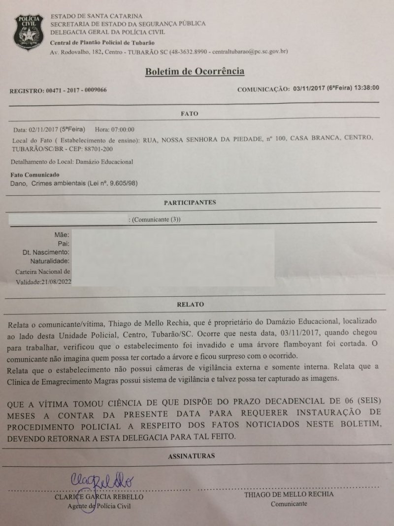 Uma árvore que ficava em frente à Escola Damásio, no Centro de Tubarão, foi possivelmente furtada durante o feriado desta última quinta-feira (2). Segundo Thiago Rechia, diretor da escola, ao chegar no local nesta sexta-feira (3), a árvore, da espécie flamboyant, havia sido removida. Provavelmente foi utilizada uma motosserra para realizar a poda. A árvore estava no local há aproximadamente 40 anos. Dois caminhões foram utilizados para recolher a planta.