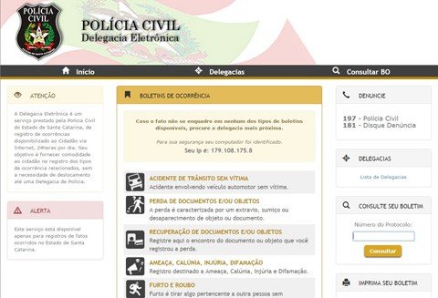 Desde ontem, ocorrências de roubo e furto em Santa Catarina também poderão ser registradas pela internet, gerando o boletim de ocorrência online. O serviço já estava disponível para perda de documentos, de objetos, recuperação de documentos e/ou objetos, ameaça, calúnia, injúria e difamação, dano causado por fenômenos da natureza e acidente de trânsito sem vítima, além do serviço de denúncia anônima.