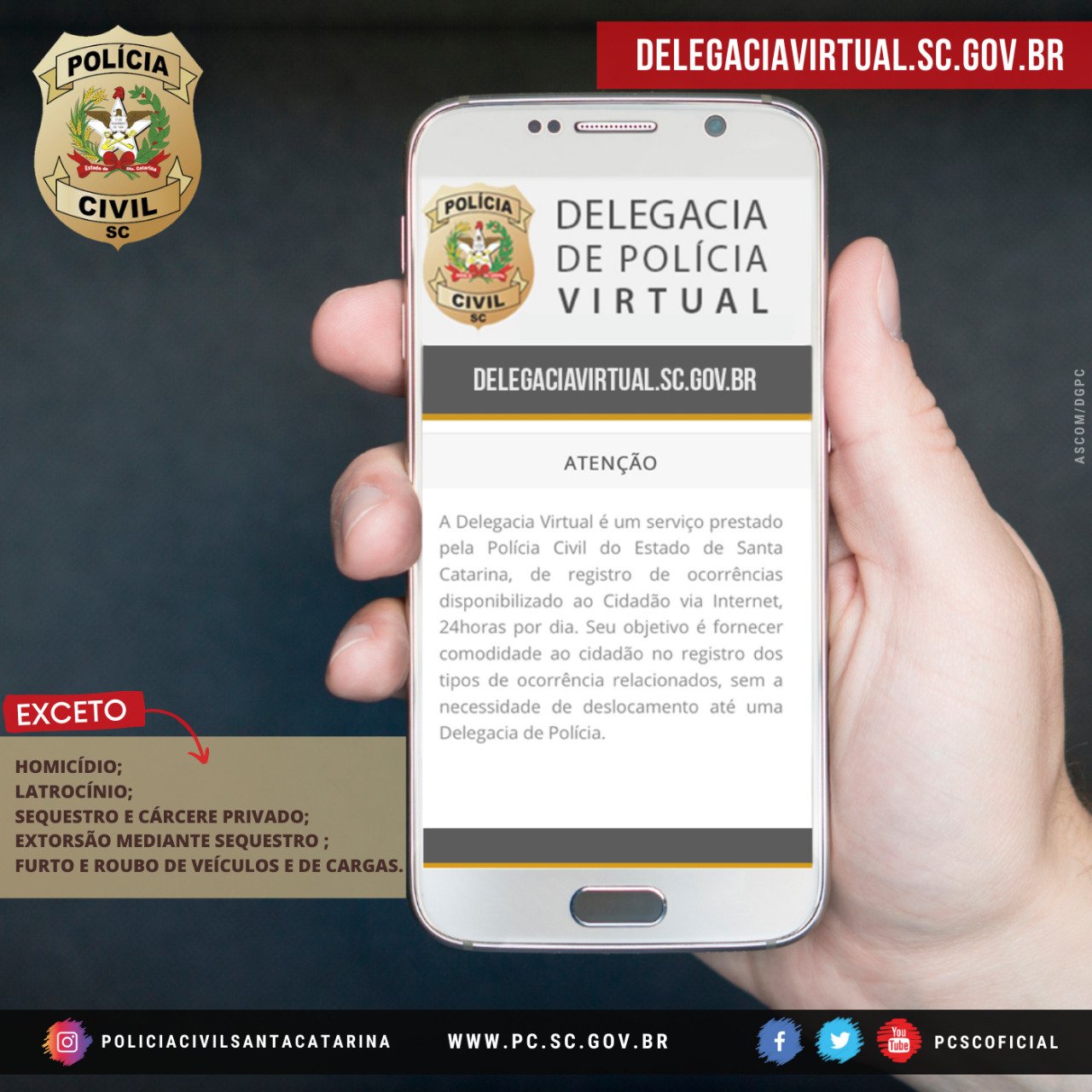 O registro então será encaminhado pelo operador e despachado por um Delegado de Polícia. Acesse a Delegacia Virtual por meio de endereço eletrônico: delegaciavirtual.sc.gov.br ou pelo site da Polícia Civil de SC (www.pc.sc.gov.br).