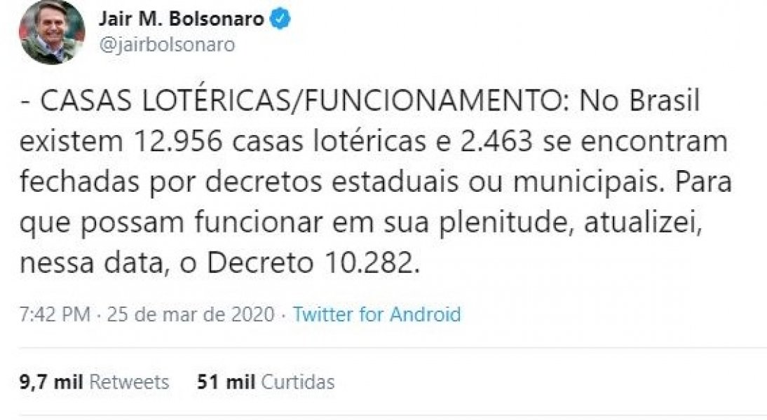 O presidente Jair Bolsonaro publicou em sua conta no Twitter que atualizou o Decreto 10.282 e que a partir desta quinta-feira estão autorizadas a abertura de todas as casa lotéricas no país.