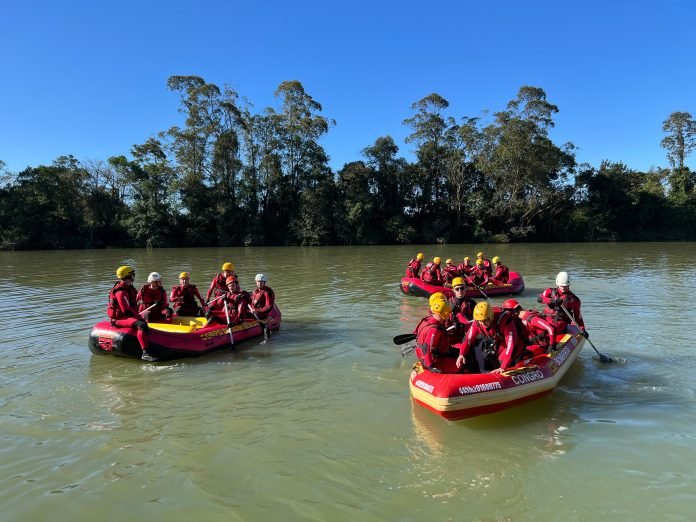 O treinamento começou com uma parte teórica, seguida por atividades práticas intensivas. Foram utilizados diversos equipamentos específicos para busca e resgate em situações de inundação e enxurradas, como: