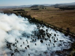 “O vento Nordeste bastante forte dificulta muito o nosso trabalho de combate, pois facilita a propagação do fogo. Outra dificuldade é o tipo de terreno, que não permite com facilidade a aproximação dos bombeiros”, explica o capitão Guilherme Virissimo Serra Costa, do Corpo de Bombeiros Militar de Tubarão.