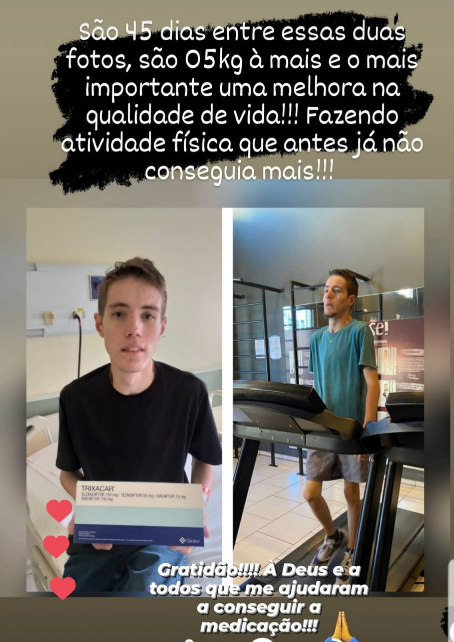 Ela explica que antes de utilizar a medicação, o jovem tinha muita dificuldade de ganhar peso, estava com 39 quilos e hoje está com 44 quilos. “Ele não conseguia mais fazer nenhum tipo de atividade física, pequenas caminhadas ou até o esforço para tomar banho a saturação caía e precisava de um suporte no oxigênio”, lembra.