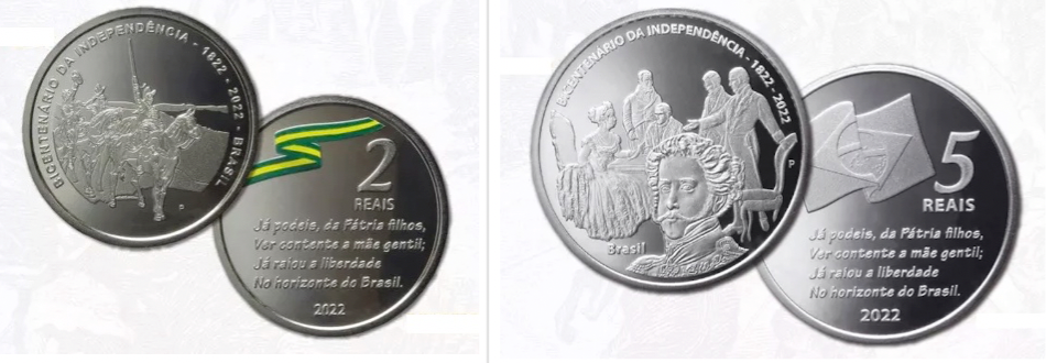 Embora seja mais barata, a versão em cuproníquel trouxe uma novidade. Essa é a primeira moeda da história do Brasil com detalhes coloridos em um dos lados. O anverso (parte da frente) tem uma faixa verde e amarela, acompanhada da primeira estrofe do Hino da Independência e do valor de face de R$ 2. O reverso (parte de trás) traz a cena do grito da independência nos moldes retratado pelo pintor Pedro Américo, no quadro Independência ou Morte. A versão em prata tem uma bandeira do Brasil na parte da frente, acompanhada do valor de face de R$ 5 e da primeira estrofe do Hino da Independência.