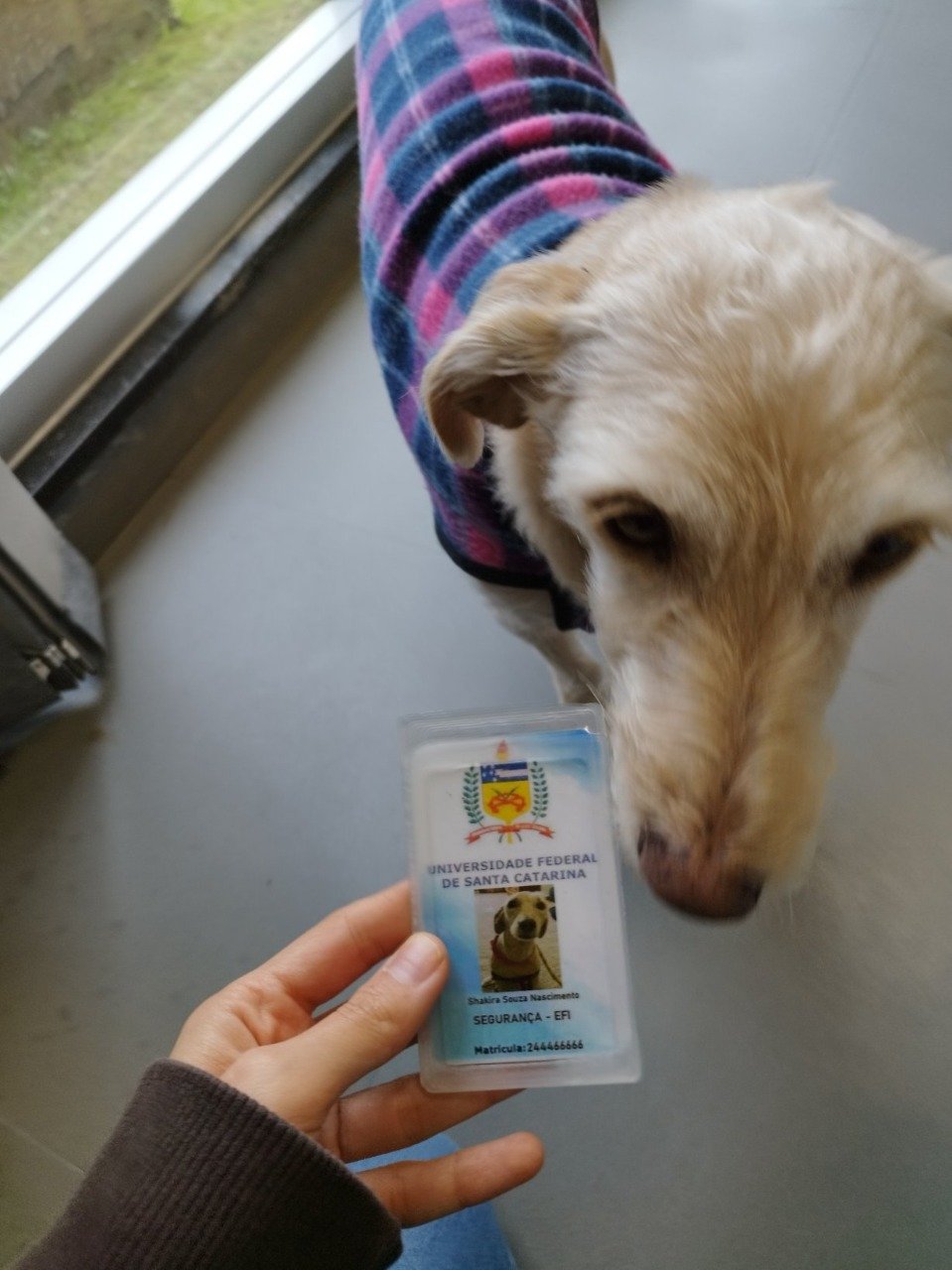 As imagens de uma cachorrinha com crachá da Universidade Federal de Santa Catarina (UFSC) viralizaram nesta semana. Shakira Souza Nascimento é identificada como segurança em uma das secretarias da instituição.