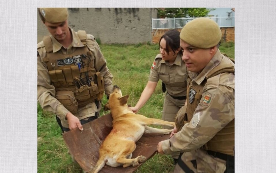 Chegando ao local, os policiais se depararam com um cão gravemente ferido, baleado. Os policiais imediatamente conduziram o cão a uma assistência veterinária, que prestou os primeiros socorros e agora está realizando uma cirurgia para a retirada do projétil no animal.