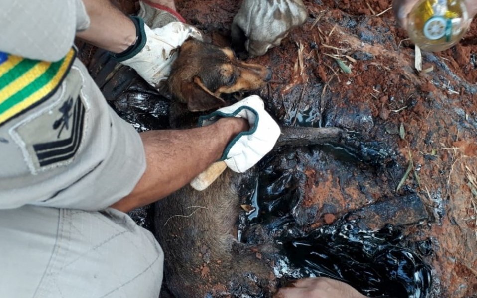 Um cachorro foi resgatado pelo Corpo de Bombeiros preso a uma poça de piche, em Senador Canedo, Região Metropolitana de Goiânia. Segundo a corporação, o animal estava com dois terços do corpo em contato com a substância. Apesar disso, ele foi retirado sem nenhum ferimento.