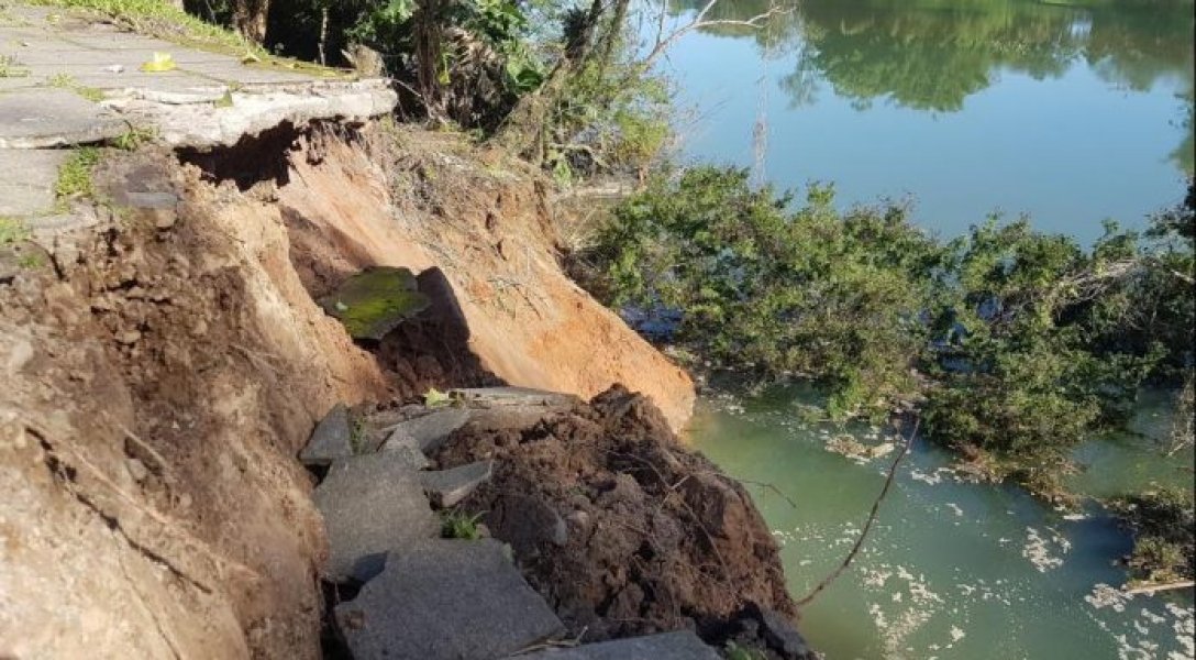 A Rua Rui Barbosa, que fica às margens do Rio Araranguá, no Centro da Cidade das Avenidas, teve parte de sua calçada desmoronada na manhã deste domingo, 19.