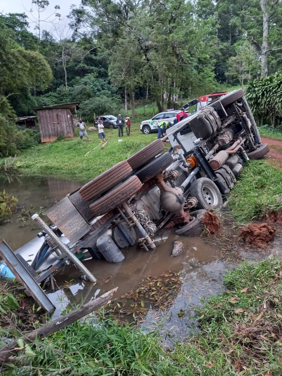 No local as guarnições constataram a ocorrência que envolveu um caminhão tanque, carregado com água, que tombou às margens de um açude. O veículo ficou lateralizado com a parte traseira parcialmente imersa na água.