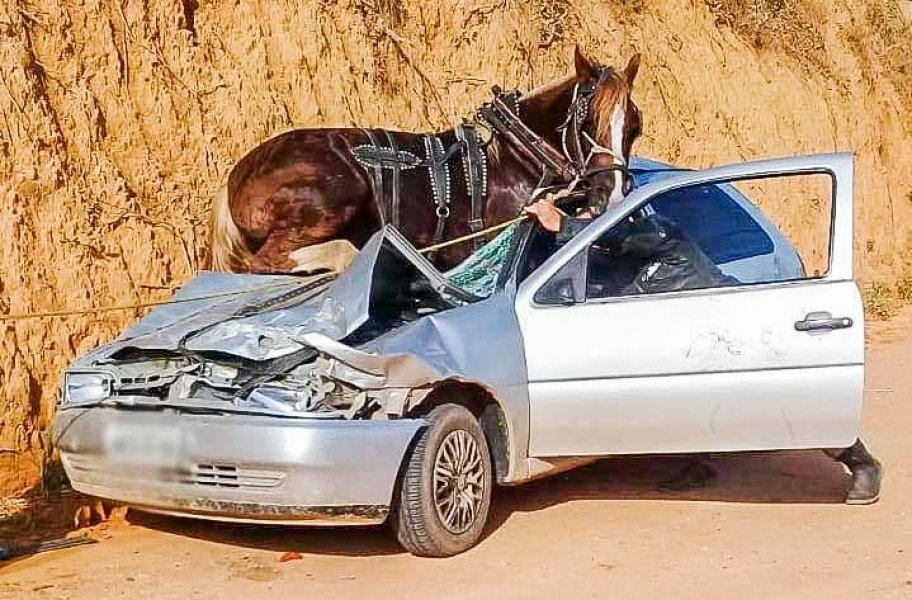 O Corpo de Bombeiros de Canelinha atendeu a uma ocorrência inusitada na tarde desta terça-feira (25). Um cavalo que puxava uma carroça teria disparado para a pista contrária e acabou batendo de frente contra um carro VW Gol. Com o impacto da batida, o animal foi parar em cima do veículo.