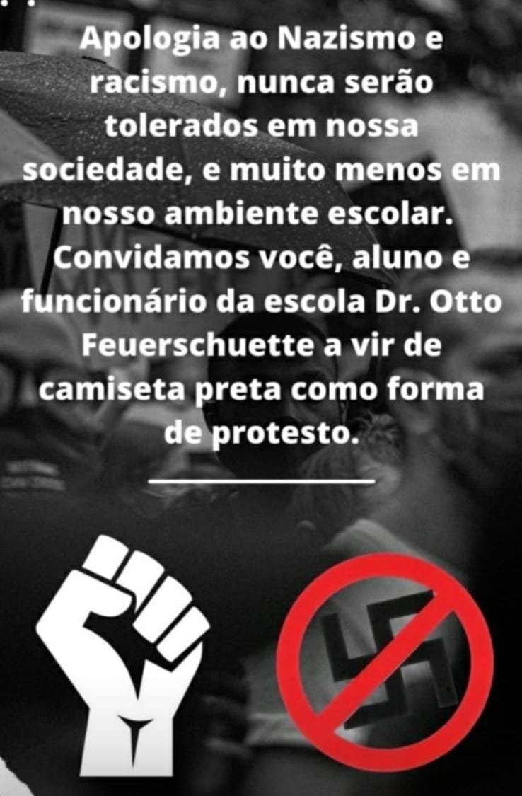 No intervalo (recreio) ocorreu um tumulto nos corredores. A direção foi informada que o aluno fazia apologia ao nazismo. Outros discentes ficaram revoltados com o ato. O estudante foi chamado pela direção e orientado pelo Conselho Tutelar.