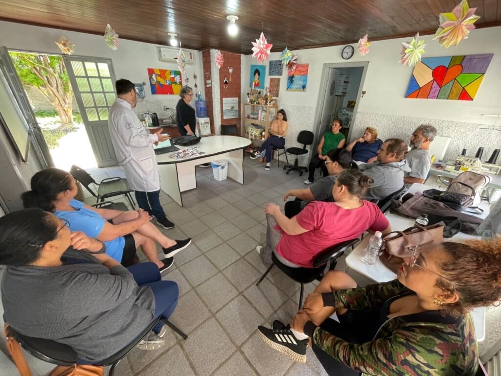 A primeira palestra ocorreu às 8h, no Centro de Convivência da Terceira Idade, voltada ao grupo Saúde e Lazer, formado por pessoas de diversas idades que participam semanalmente de atividades físicas e recreativas.
