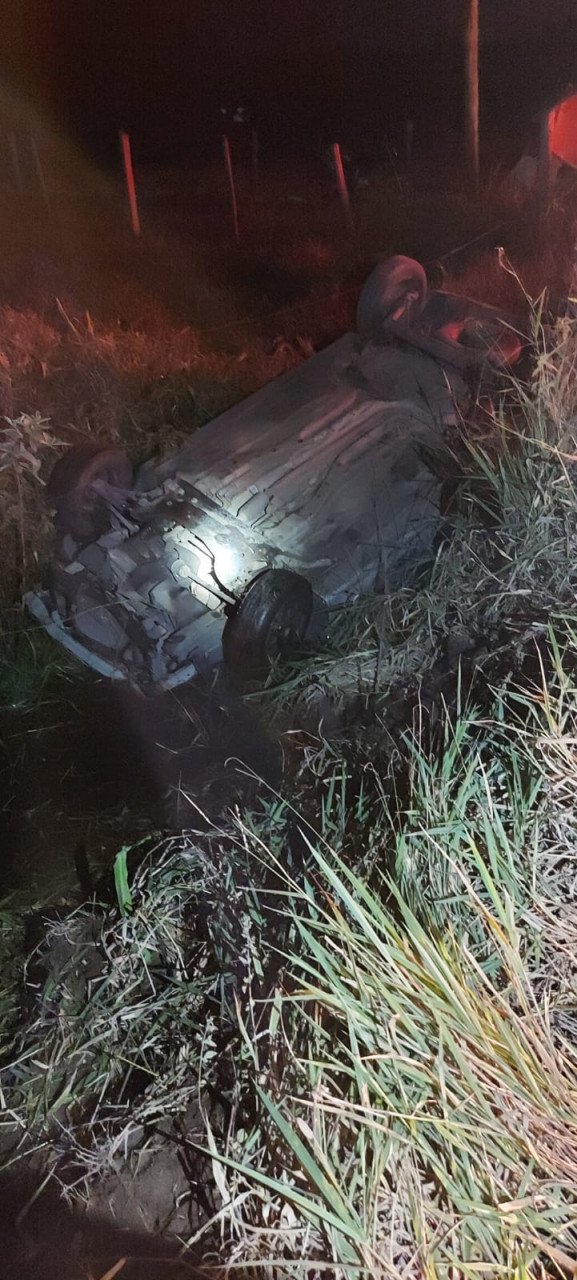 No local os profissionais identificaram se tratar de um capotamento de veiculo. Ele estava tombado com rodas para cima, fora da pista em um valo. A vitima, homem, estava consciente, orientado e sinais vitais normais.