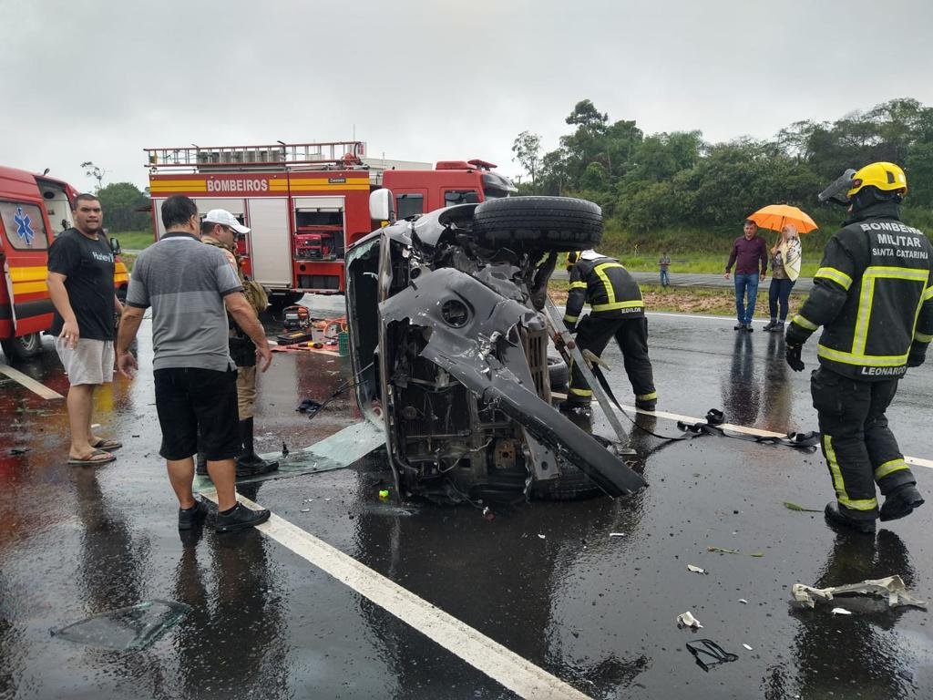 Tratava-se de um veículo Toyota Hilux com placas de Sombrio. Nele havia sete pessoas, sendo cinco adultos e duas crianças. Quando a guarnição chegou, dois adultos estavam presos no carro.