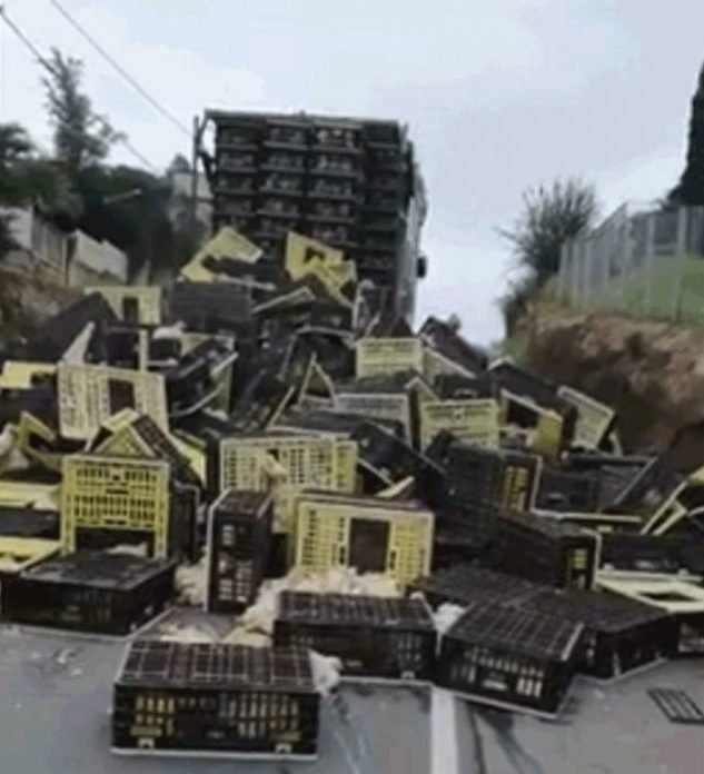 Mais um acidente foi registrado na rua São Cristóvão, no bairro Demboski, em Criciúma. Na manhã desta quinta-feira (11), por volta das 6h, uma carga viva de frangos tombou na via.
