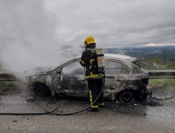 Um carro Volkswagen Gol pegou fogo após colidir contra uma mureta de proteção na SC-390, na Serra do Rio do Rastro, em Lauro Muller. O acidente de trânsito aconteceu por volta das 14h30 desta quarta-feira (12).