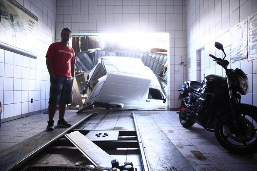 “Era um tornado, nós vimos. Eu fiquei apavorado com os meninos que tinham ficado do lado de fora. Foram segundos de desespero, porque vimos que a Fiorino voou como um papelão e caiu na troca de óleo”, relata o gerente Jeferson Nunes, que se abrigou na loja e viu a cena de fora.
