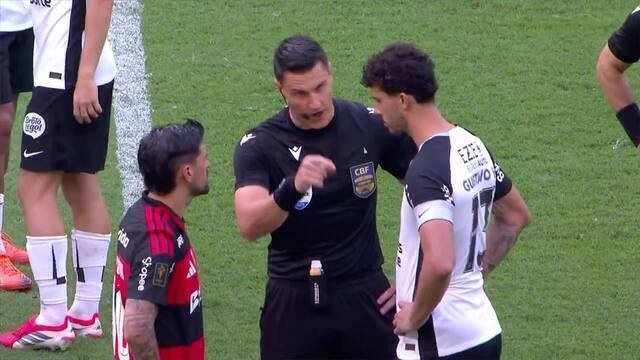 Com os jogadores posicionados em campo, Rafael Klein chamou os capitães Arrascaeta, do Flamengo, e Gustavo Henrique, do Corinthians, para explicar o procedimento e avisar que iria analisar o lance à beira do campo.