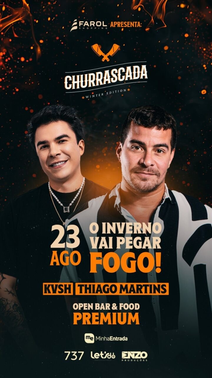 Evento acontece dia 23 de agosto, no Farol Shopping, em Tubarão (SC), com KVSH, Thiago Martins, open bar e open food premium