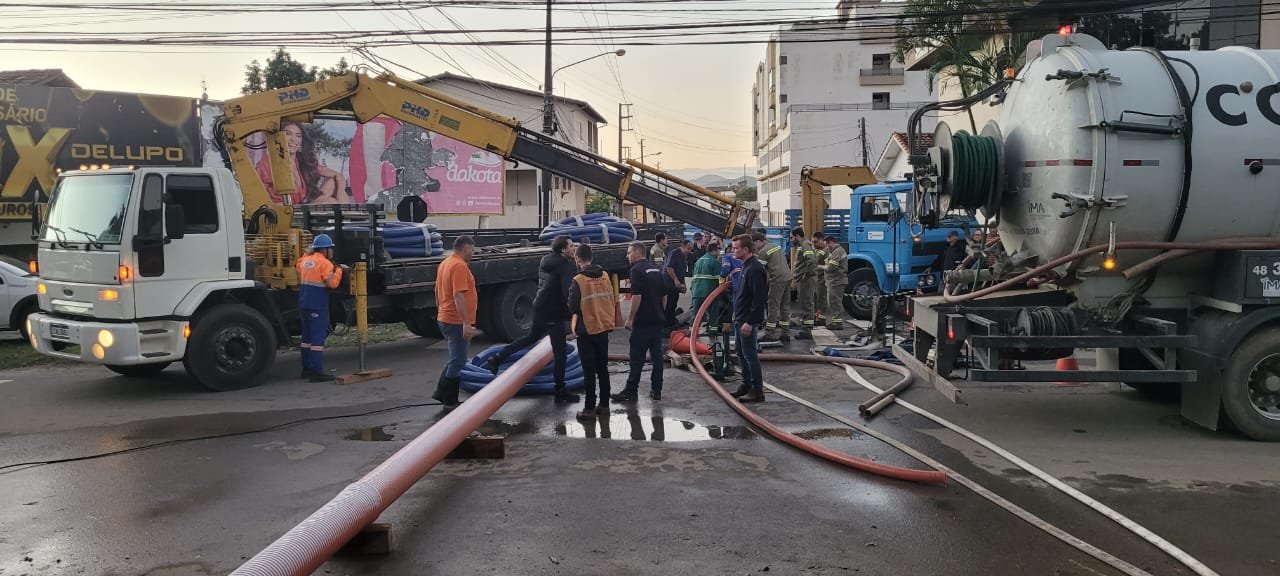 Praticamente toda a infraestrutura e pessoal da Prefeitura de Tubarão foi empregada na recuperação da cidade nesta quinta-feira. As frentes atuaram em diversos bairros com o intuito de minimizar os problemas gerados pela chuva, em especial na localidade da Madre e nos bairros Humaitá e Dehon. Na Madre, o problema foi o rompimento de uma tubulação na Rodovia Aggeu Medeiros. Para controlar a vazão da água, são colocadas rochas para impedir que a água retorne para a localidade conhecida como Campo da Eira. Outra situação de preocupação é o grande volume de água nos bairros Humaitá, principalmente no entorno da Rodoviária, e Dehon. O problema, em grande parte, foi ocasionado pela falha do motor de bombeamento do sistema de drenagem, que foi completamente coberto pela água. Nesta quinta-feira, máquinas para drenar a água foram utilizadas a fim de permitir a troca da peça por uma emprestada pela Diamante Energia. O serviço é feito com o apoio da Higienelar e Tubarão Saneamento. Paralelamente à troca do motor, será utilizada uma bomba agrícola acoplada a um trator, que ajudará na sucção da água.
