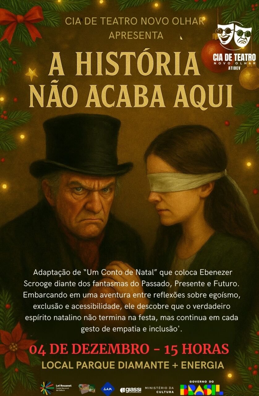 A Cia de Teatro Novo Olhar, primeira companhia teatral de Tubarão formada por pessoas cegas e com baixa visão, apresenta nesta quarta-feira (04), às 15h, o espetáculo “A História Não Acaba Aqui”, no Parque Diamante + Energia. A peça é inspirada em Um Conto de Natal, clássico de Charles Dickens, e convida o público a refletir sobre solidariedade, acessibilidade e humanidade.