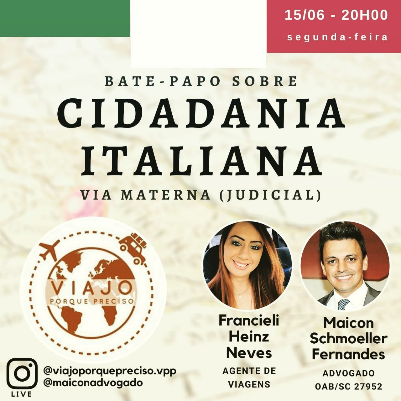 Diante do espírito de viajante e do interesse em ajudar mais pessoas que possam ter direito à cidadania e não sabem sobre, para esta segunda-feira (15), às 20h, por meio do Instagram (@viajoporquepreciso.oficial), Franciele realizará um bate-papo descontraído com o advogado de Braço do Norte, Maicon Schmoeller Fernandes, eles se conheceram pelas redes sociais e descobriram que são parentes e descendentes de italianos, apesar de não carregarem sobrenome italiano.