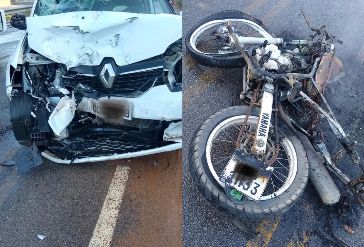 Uma colisão frontal entre um automóvel Renault Sandero branco com placas de Belo Horizonte e uma motocicleta Yamaha Tenere 250 azul, com placa do Mercosul, resultou na motocicleta incendiada.