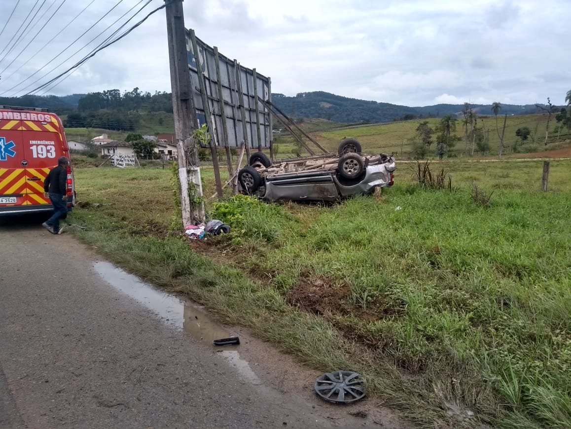 Após a colisão frontal entre dois carros no início da tarde deste sábado (27), um dos veículos saiu da pista da rodovia SC-108 e acabou capotando. O acidente ocorreu no KM 2, em São Ludgero.