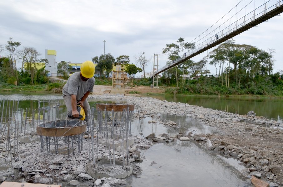 Agora, a empreiteira fará na margem esquerda os blocos de coroamento (sapatas), as colunas e, por fim, a travessa para o encaixa das vigas que formarão a passarela. Na margem direita, uma coluna já está com as três etapas de construção prontas e a outra resta ainda a travessa.