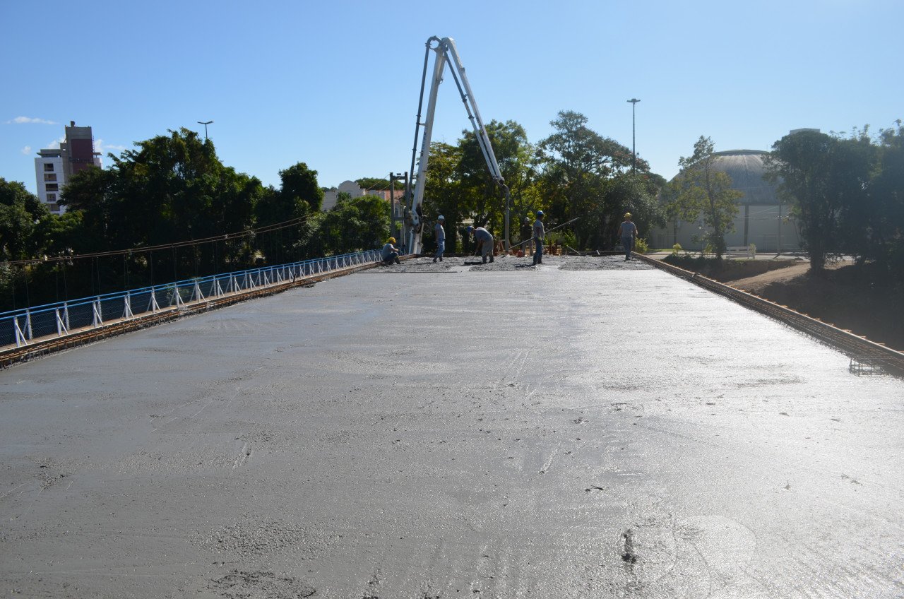 Na passarela a colocação de concreto nesta quinta-feira (14) formou o pavimento da chamada praça de contemplação, espécie de pequena praça no centro da estrutura onde os usuários poderão observar o visual do Rio Tubarão. Agora, resta apenas a concretagem das pré-lajes das vigas da margem esquerda, o que acontecerá até o fim deste mês, além da colocação dos postes de iluminação e da estrutura dos guarda-corpos.
