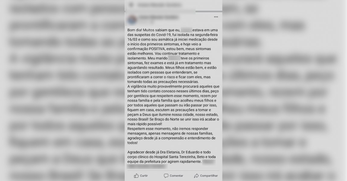 “Muitos sabiam que eu, (…) estava em uma das suspeitas do Covid-19, fui isolada na segunda-feira 16/03 e como sou asmática já iniciei medicação desde o início dos primeiros sintomas, e hoje veio a confirmação POSITIVA, estou bem, meus sintomas estão melhores. Vou continuar tratamento e isolamento. Meu marido (…) teve os primeiros sintomas, fez exames e está já em tratamento mas aguardando resultado. Meus filhos estão bem, e estão isolados com pessoas que entenderam, se prontificaram a correr o risco e ficar com eles, mas tomando todas as precauções necessárias.
