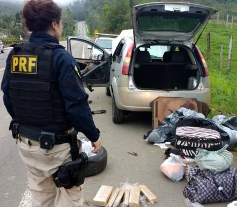No interior do Fiesta, que era conduzido por uma mulher de 30 anos, foi confirmada a presença de sete tabletes de maconha, totalizando 5,130 quilos. Um dos volumes da droga estava no colo da passageira, de 52 anos, e os outros seis foram encontrados dentro da forração das portas.