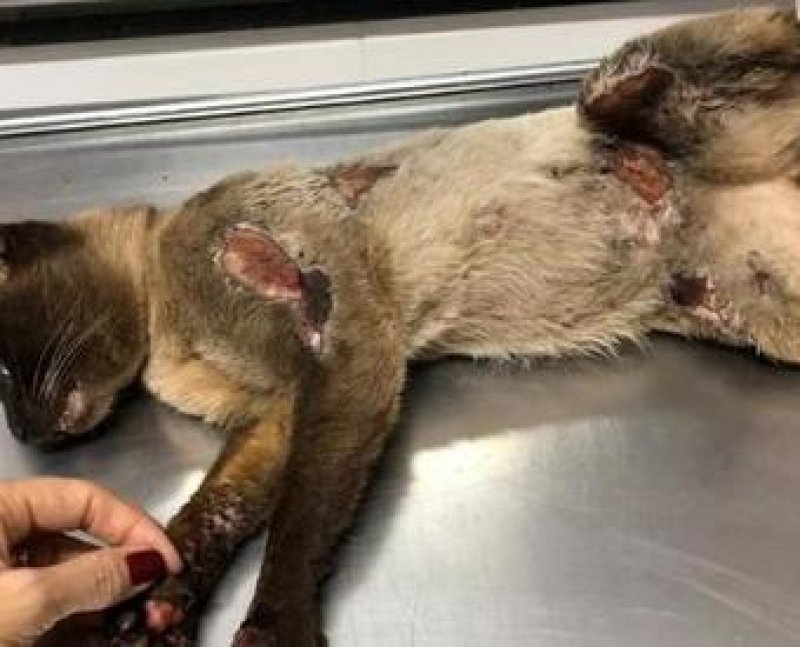 O gatinho foi socorrido e levado para Clínica Veterinária Xanxerê com muitas escoriações e ferimentos. Seu estado é grave.