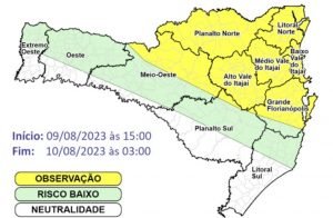 Nas regiões em amarelo do mapa, os acumulados no período devem variar entre 30 e 60 mm, podendo pontualmente superar estes valores. O risco para ocorrências como alagamentos e deslizamentos pontuais é moderado nas áreas em amarelo e baixo nas áreas em verde do mapa.