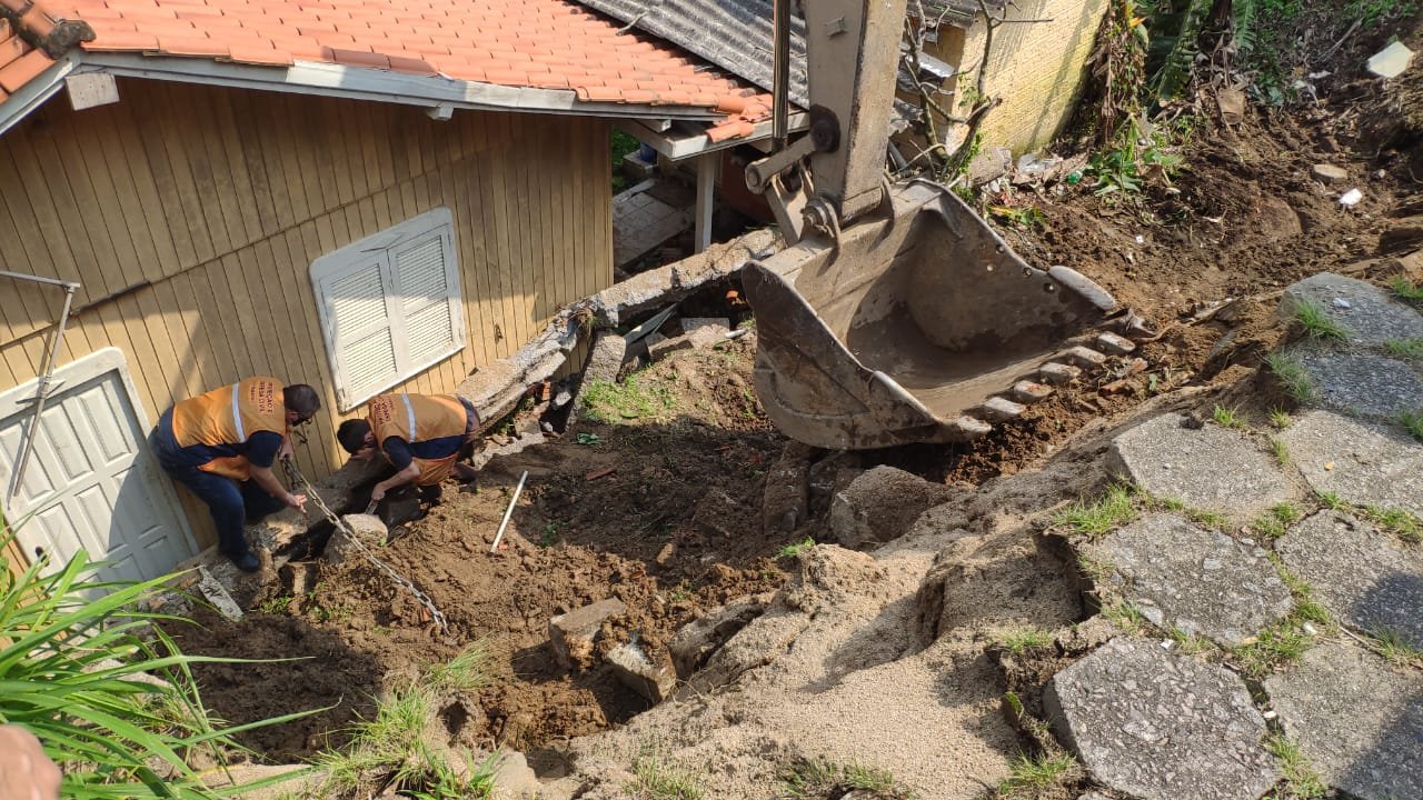 Como nesta sexta o dia estava em boas condições climáticas foi possível realizar a primeira etapa do serviço, que consistiu na retirada de pedras e entulhos, diminuindo os riscos de materiais pesados atingirem a residência. O trabalho foi realizado por uma equipe de limpeza da secretaria de Infraestrutura esteve no local.